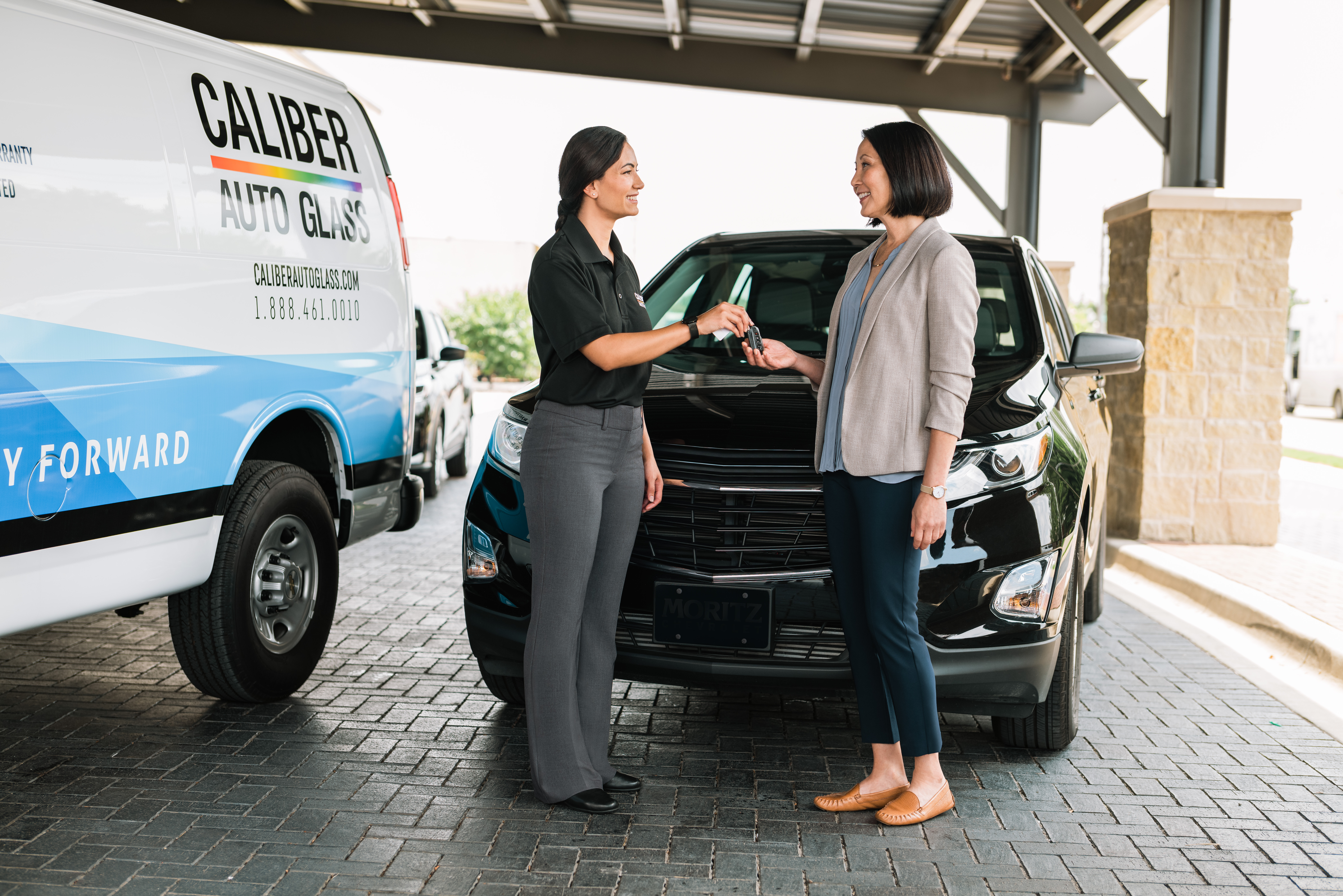 Caliber Auto Glass Repair Tech delivering vehicle to customer after windshield repair.