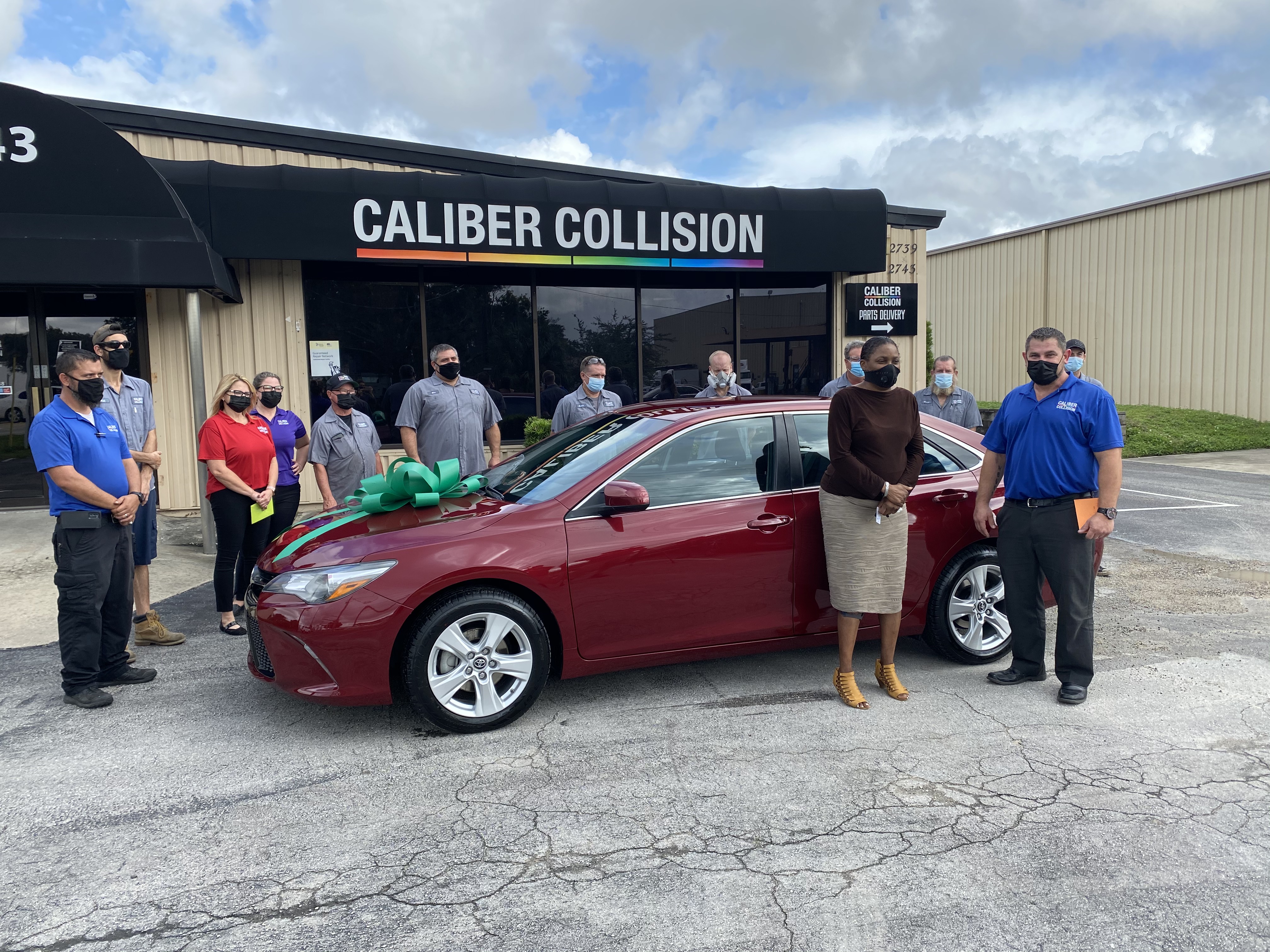 Recipients and the Caliber Collision team at a NABC Recycled Rides event.